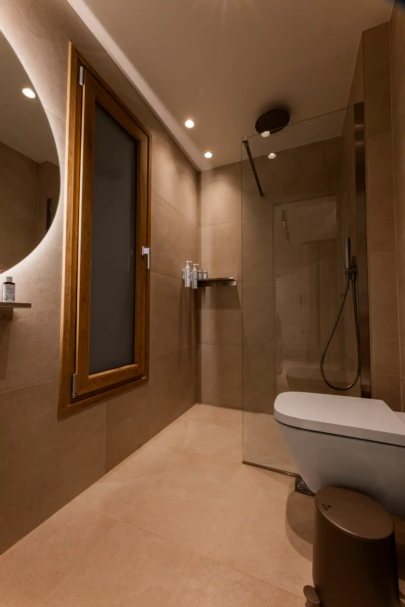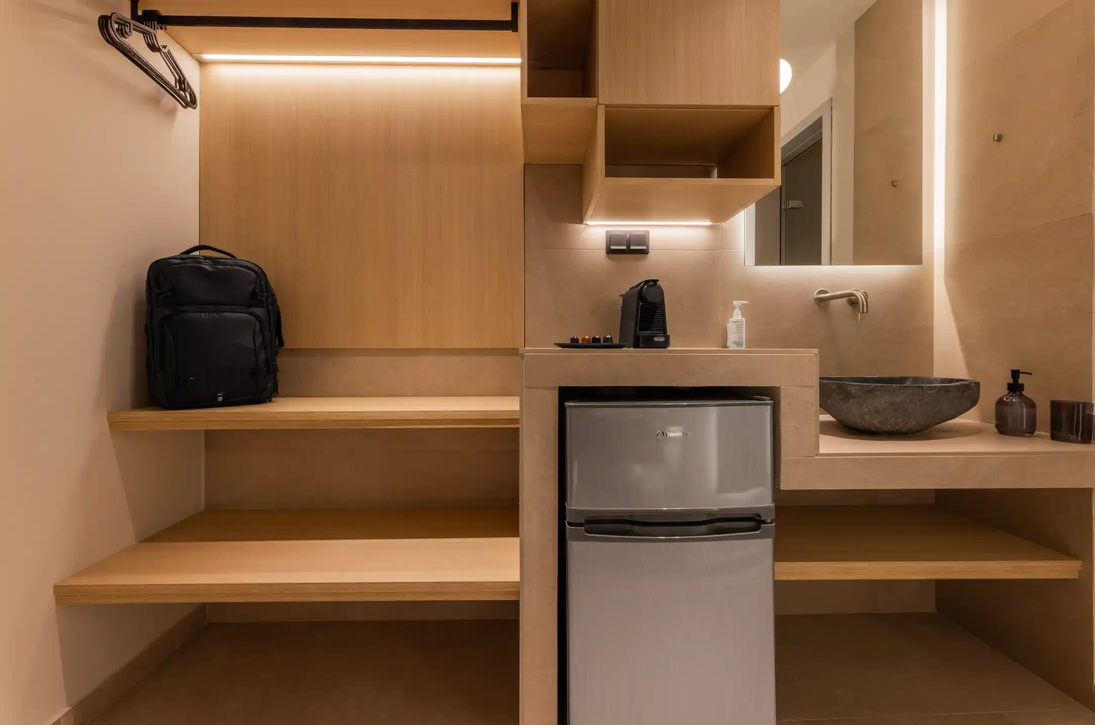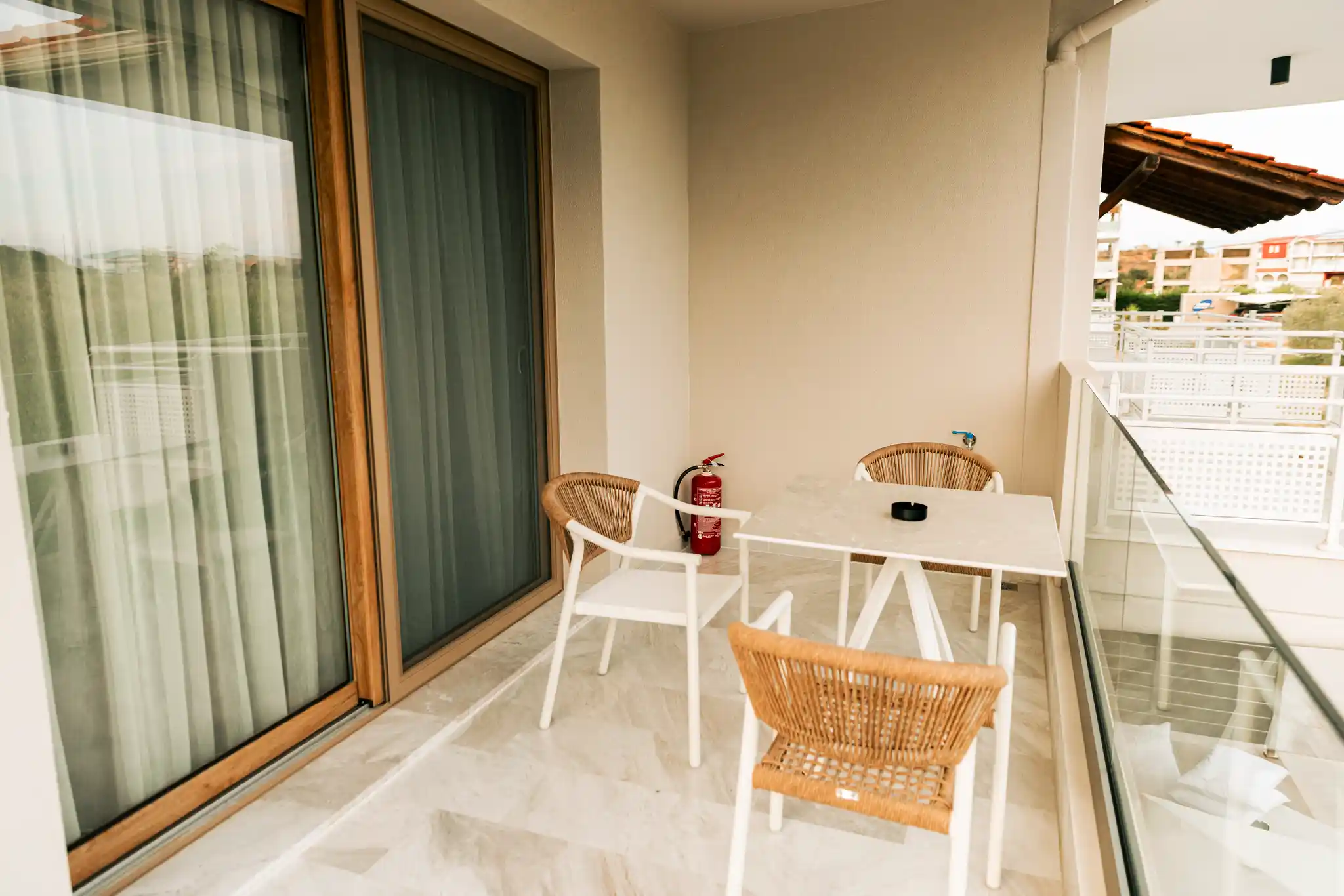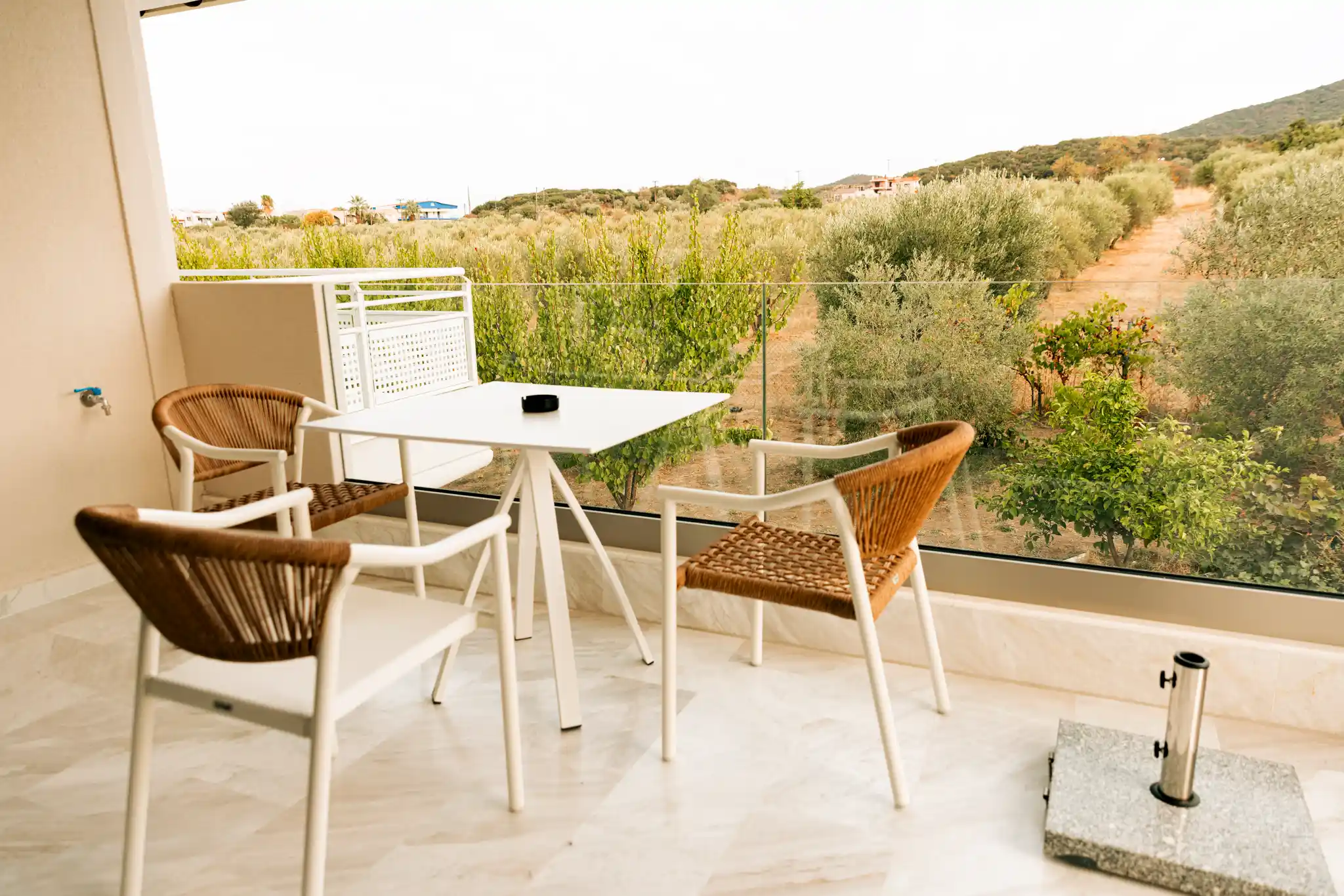 The Deluxe Double Room 13, with a total area of 23 sq.m., offers maximum comfort and can accommodate up to 3 guests. It is the ideal choice for couples, small families, or visitors seeking high-quality accommodation with premium amenities. It is located on the first floor of the building and feature a private balcony, offering moments of relaxation with view of nature and serene surroundings.