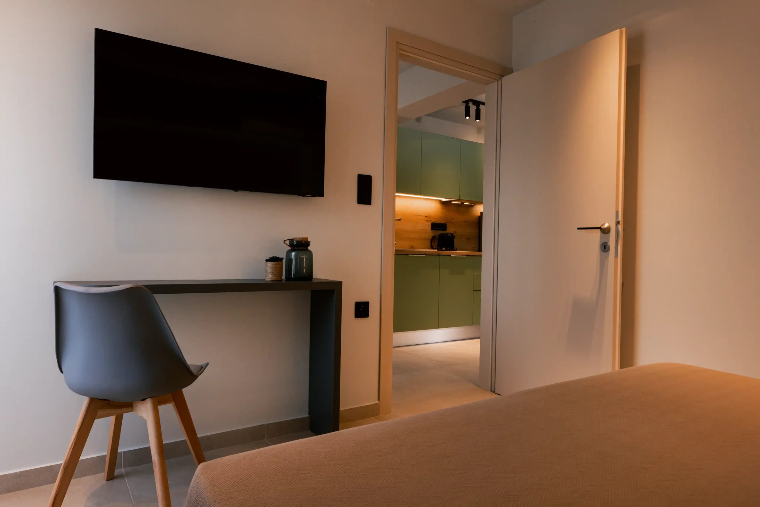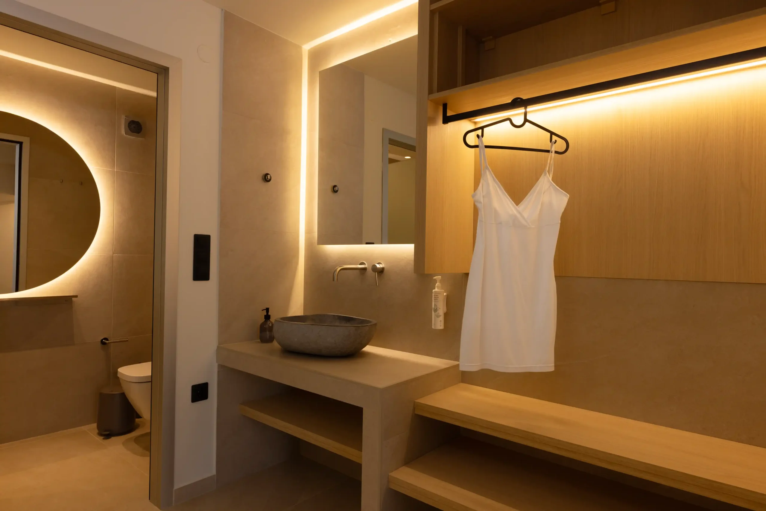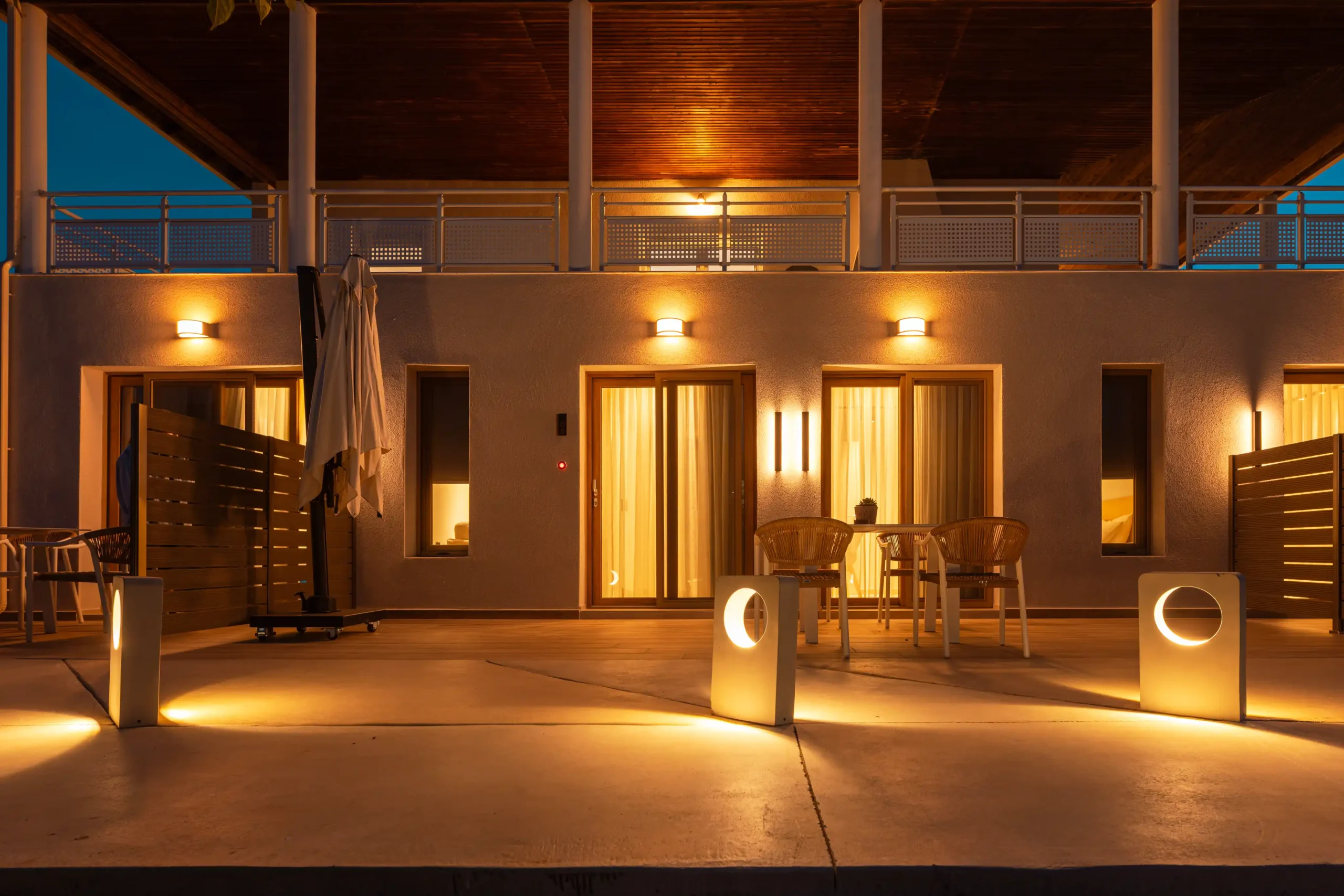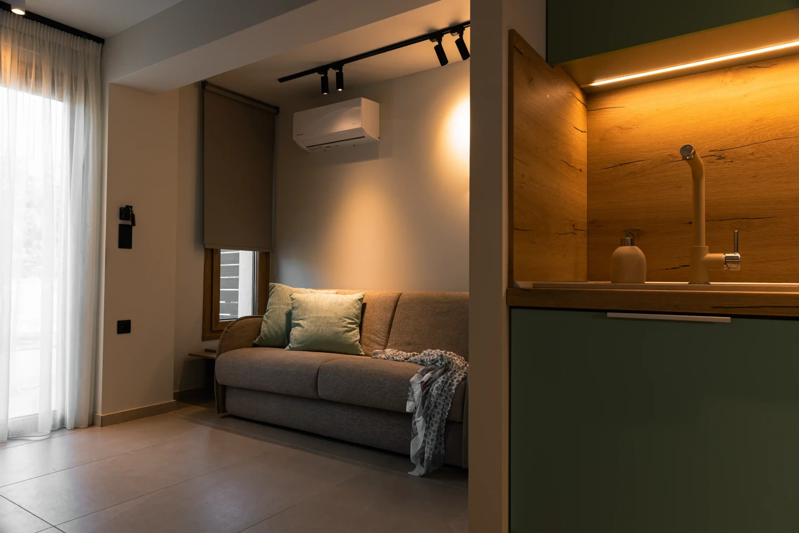 The Junior Family Suite 06, with a total area of 33 m², offers an elegantly designed space where comfort meets effortless luxury. It is ideal for families or small groups of up to 4 guests seeking a refined and relaxing stay in Sarti.